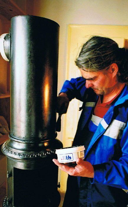 Ofenschwärze, also Grafit in einer Trägerflüssigkeit, weil die Verzierungen damit am besten zur Geltung kommen und dem Ofen seinen antiken Charakter zurückgeben.